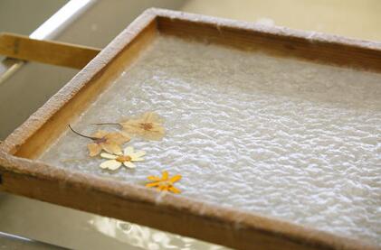 和紙由名為“流漉”的傳統(tǒng)技術(shù)制造而成。將名為“漉舟”的木箱泡在水槽里,通過(guò)前后左右不斷晃動(dòng)而制造出厚度均勻的紙。這種纖維復(fù)雜纏繞而成的和紙,無(wú)論是縱向還是橫向都不易破損,柔韌度高,薄而結(jié)實(shí)。