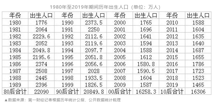 新生人口是母嬰行業(yè)基本盤中的基本盤。進(jìn)入21世紀(jì)以來,這二十年間總共有多少人出生?隨著出生率逐年下降,00后和10后,相比80后和90后,究竟少了多少人?近日,第一財(cái)經(jīng)根據(jù)歷年統(tǒng)計(jì)公報(bào)、公開數(shù)據(jù)統(tǒng)計(jì)梳理發(fā)現(xiàn),我國80后、90后、00后、10后人數(shù)分別為2.21億、2.08億、1.63億(16258萬)、1.63億(16306萬)。